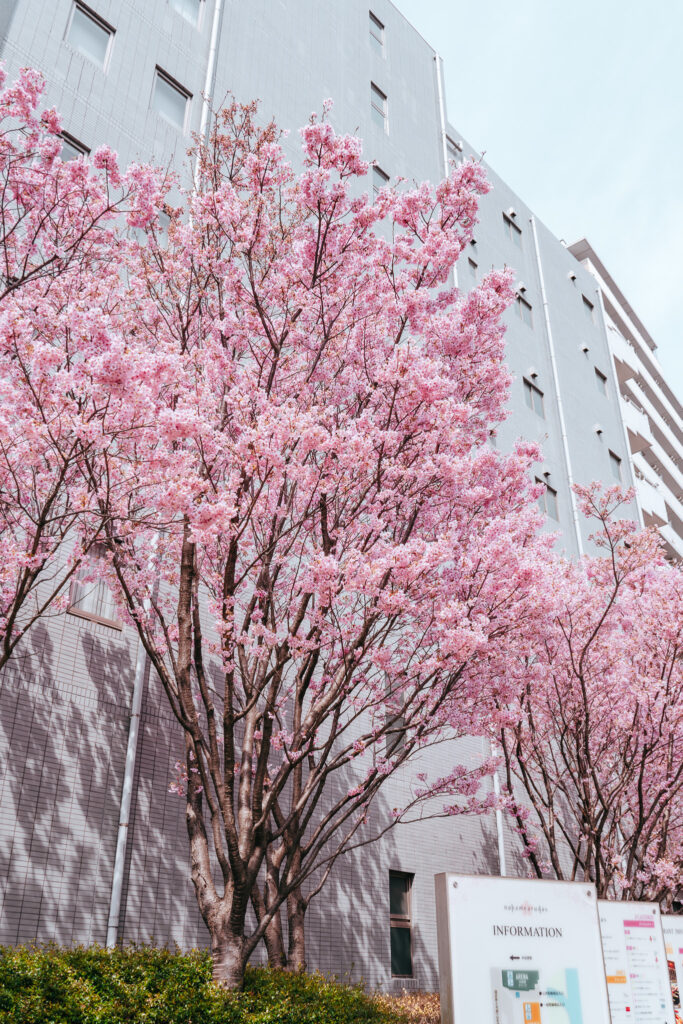 すると、歩き始めてすぐの一角に桜を発見。目黒川の桜はほとんどがつぼみですが、春を待ちきれない木があるんだと思いました。みなさん見上げて、パシャリ。桜の色は、毎年見ても決して飽きることのない色。ただのピンクではありません。
